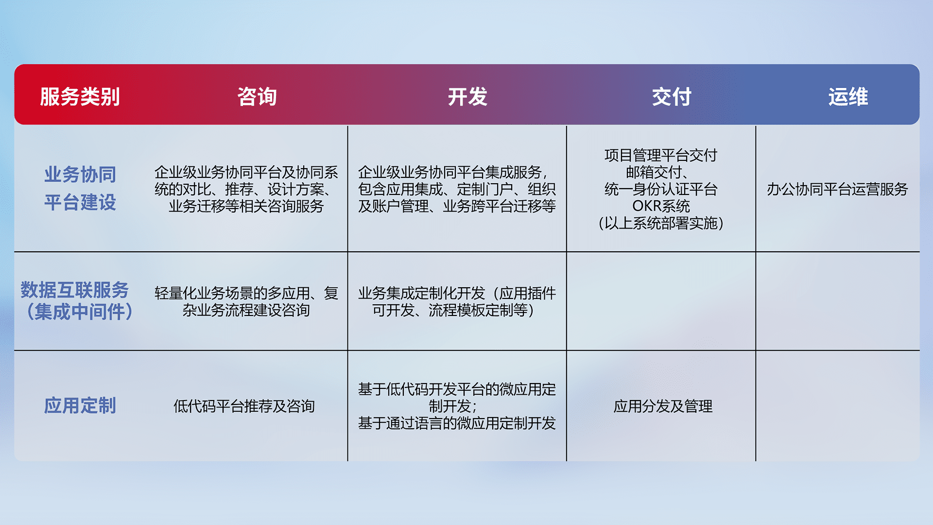 针对钉钉、、、、企微、、、IDaas等平台级产品提供产品的规划、、、、方案、、交付、、、、定制化开发等服务,,实现如统一协同办公、、智能客户服务、、、、混合会议管理、、智能数据查询、、等业务场景,,,实现数字化转型。。